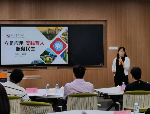 环境与公共健康学院副院长郝春莉汇报了学院坚持以学生为中心,探索构建以课内实践为主,以科研、竞赛项目为辅由浅入深、课内外结合的“1+2+3+N”的实践育人体系,发挥环境与公共健康学院的实验室优势,全方位推进学生全员参与课内外实践训练,提高学生的实践能力和社会服务能力。