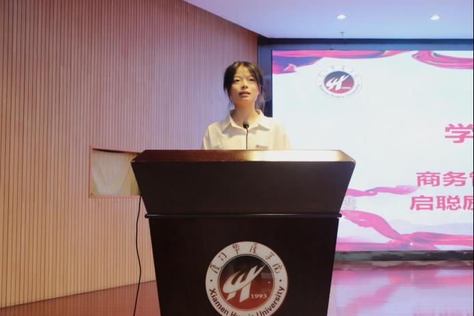 学生代表、启聪立志奖学金获得者何亚萍代表学生发出倡议,呼吁全体同学以华厦学子主人翁意识积极行动,从我做起、同舟共济、众志成城,把学校的荣誉当作自己的荣誉,自觉维护学校的良好形象,用青春的能动力和创造力激荡起爱校荣校的澎湃春潮,用青春的智慧和汗水打拼出一个更加美好的华厦,在青春的赛道上跑出华厦青年的最好成绩!