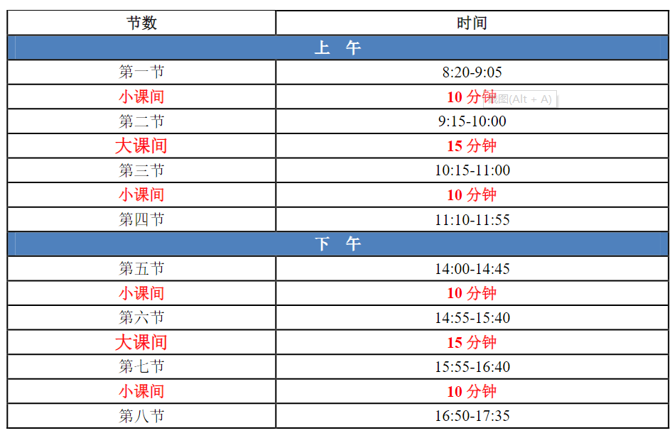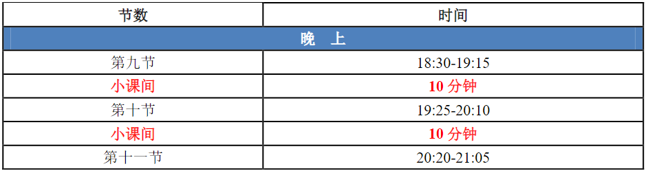 一、2月21日起开始为期两周的在线学习(即2月21日-25日,2月28-3月4日)。课表公布时间暂定为2月18日下午3点后,届时同学们务必登入教务系统查看课表,按照课表时间进行在线学习。经学校研究决定,从本学期开始调整教学作息时间,具体如下,请同学们依此执行。