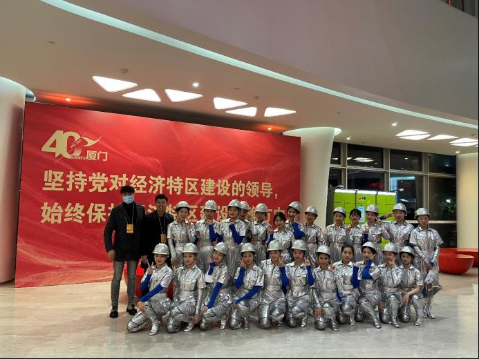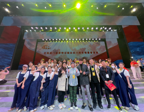 为庆祝厦门经济特区建设四十周年,由中共厦门市委、厦门市人民政府主办,中共厦门市委宣传部、厦门市文化和旅游局、厦门市文学艺术界联合会联合承办的《“踏浪高歌”庆祝厦门经济特区建设四十周年情景音诗画》12月21日晚上在闽南大戏院隆重上演。我校人文学院音乐教育系主任朱晓乐老师带队、李峥等多位老师负责此次实践实训,艺术教育专业30名学生参演的大型歌舞节目《闯》和《一路前行一路歌》,在晚会第一篇章《花开的征程》中展演。