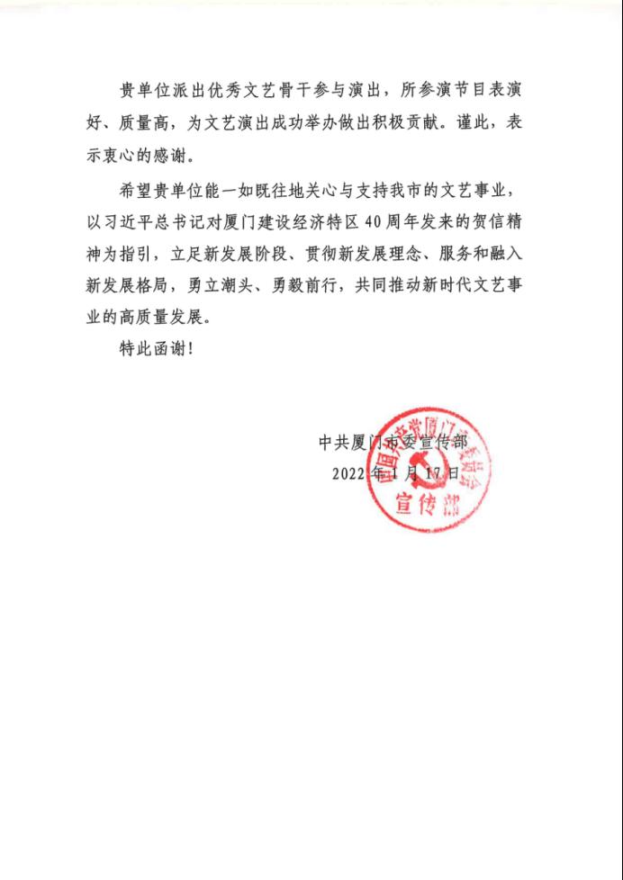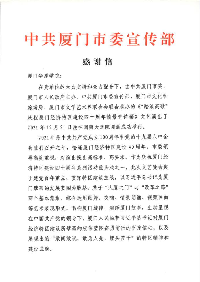 此次演出,不仅展现了我校学子的风采,锻炼了学生的协作能力,增强学生的集体荣誉感,也坚定了新一代青年人在新征程上的初心和勇于担当时代使命、传承“厦门精神”的年轻气概。同时得到了各级领导的充分肯定和好评,演出结束后,中共厦门市委宣传部给我校发来感谢信,高度赞赏我校所参演节目表演好、质量高,为文艺演出成功举办作出积极贡献。