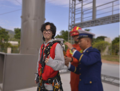在消防员的指导下,我体验了救援绳索上升下降。一开始看消防员示范的时候,感觉对于平日热爱锻炼的我来应该很简单,但当我真正去体验后,才发现有多不容易。消防员们艰苦的训练日常,出任务时竭诚为民、赴汤蹈火的大无畏精神,令我十分敬佩。