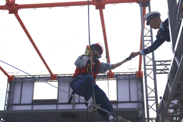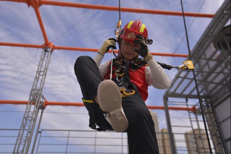 在消防员指导下,同学们体验绳索上升下降