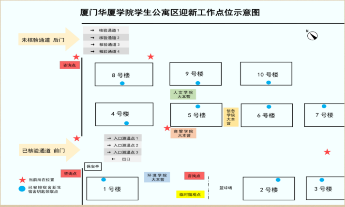 (温馨提醒:新生报到系统查询不到住宿信息的新生,前往学生公寓学院大本营进行宿舍安排,其余流程参照正常执行。具体核验地点见示意图。)