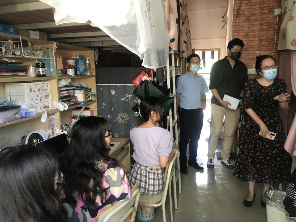 疫情发生以来,院系党政负责人、班主任、辅导员、科任教师深入宿舍看望、慰问学生,特别是加强封闭管理期间学生的思想引导、心理疏导、健康教育和学习生活指导,引导同学们能以积极的心态面对严峻的疫情挑战。针对学院重点地区旅居史的师生,学院密切关注他们的健康状况,及时了解他们的困难和需求;中秋、国庆假期,学院党政负责人走访师生宿舍,看望慰问师生,为师生送去疫情下中秋、国庆的温暖与关怀,带去疫情防控时期的叮咛嘱托。