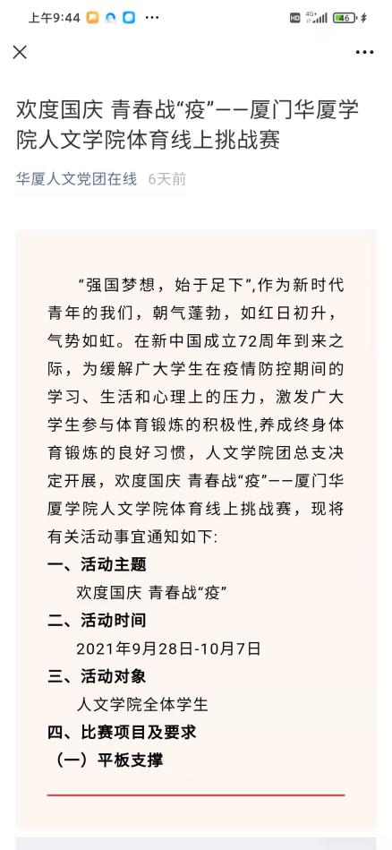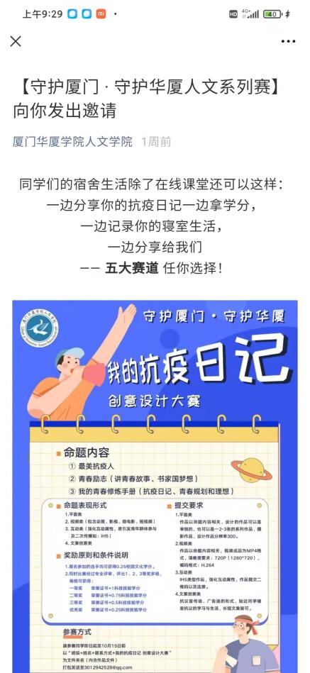 在线上授课和封闭式管理环境下,为了让同学们生活不枯燥,人文学院结合专业特点,开展了“守护厦门·守护华厦”人文五大赛道系列赛,“我的抗疫日记”创意设计大赛、“音乐艺术·防疫绽放”音乐舞蹈网络比赛、“抗击疫情·你我同行”英文配音大赛、“经典咏流传·战疫颂”英文朗诵大赛、“每逢佳节倍思亲” 中秋三行家书征集等活动精彩纷呈,人文学子一边分享抗疫日记一边拿学分,一边记录寝室生活,一边分享给同学们。国庆假期,人文学子也没“闲着”,学院团总支、学生会推出“欢度国庆·青春战‘疫’”体育线上挑战赛、“‘云’学万卷”每日学习小打卡等假日“套餐”。同时,学院还发动学生积极参加校学生处、团委、体育教学部等部门组织的“‘云’端抗疫”线上健身气功比赛等活动,让同学们在“云端”学习生活中“有滋有味”。