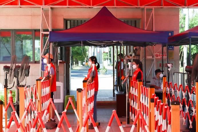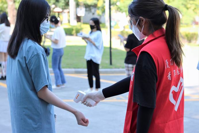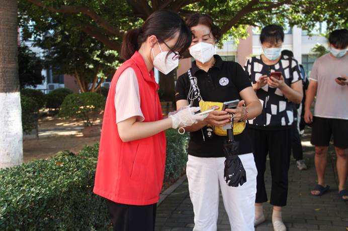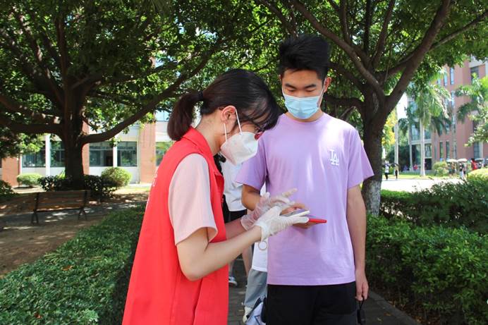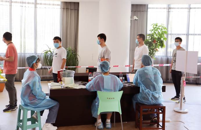 本轮检测中,学校科学总结第一、二、三轮核酸全员检测经验,密切与属地防控部门联动,精准统计人员信息,发挥环境与公共健康学院优势,组建具有核酸检测采样证书的校医、医学技术类专业教师加入采样,减轻市区医护采样人员压力。同时集结教师党员志愿者、学生志愿者,分落在秩序维护、物资保障、信息录入、后勤服务、测温扫码等岗位上,进一步优化检测流程,现场组织规范高效、秩序井然。本次采样现场仍然设置了入口测温和查验健康码区、信息采集区、核酸采样区、临时隔离处置区等区域,开设了6个采样单元,做到区域单向通行,全程闭环式管理。