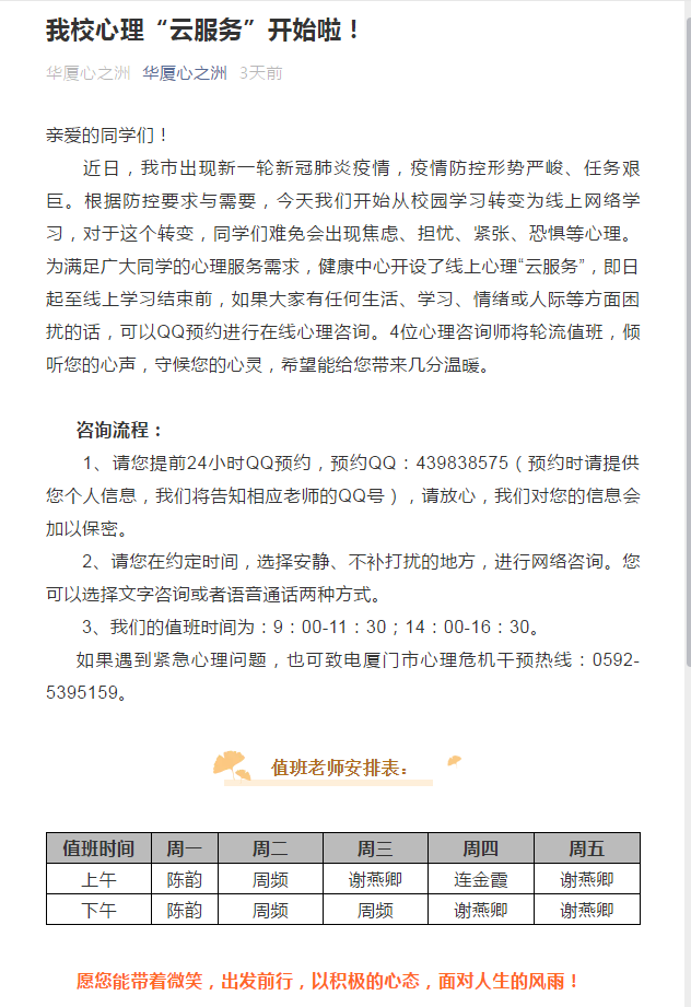 为切实加强疫情防控工作,更好保障学生的身心健康,学校积极行动,多措并举,有序开展疫情防控期间的学生心理健康教育与服务工作。
