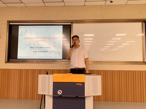 孙永泰副主编介绍了目前学术期刊投稿的现状,以及2015年我国全面深化出版体制改革之后相关政策对教师投稿的影响,给出两个突破点的建议,并对青年教师的职业规划提出建设性意见。张仪华教授则深入浅出从论文选题、论文写作及论文修改等方面展开具体介绍。