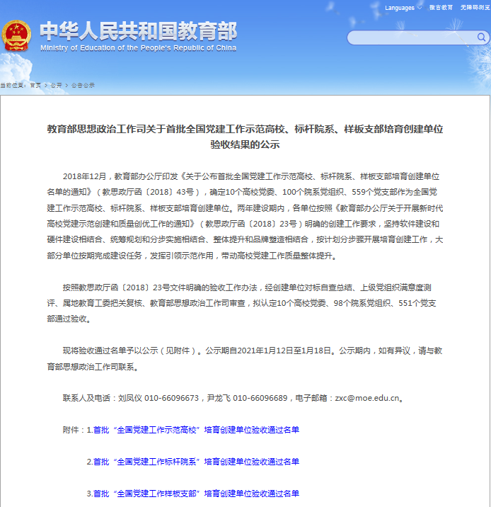 近日,教育部发布了《教育部思想政治工作司关于首批全国党建工作示范高校、标杆院系、样板支部培育创建单位验收结果的公示》,对通过验收的10个高校党委、98个院系党组织、551个党支部名单进行公示。我校信息与智能机电学院教工党支部如期完成首批“全国高校党建工作样板支部”建设任务并通过验收。