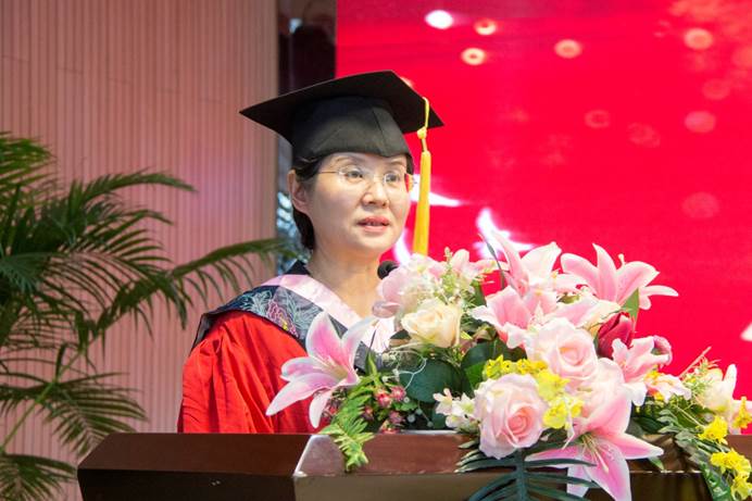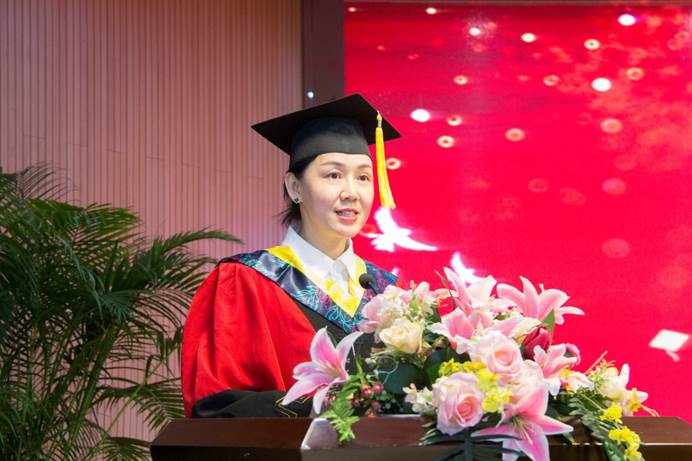 商务与管理学院常务副院长冯宇蕾作为教师代表致祝福辞,她希望同学们在追逐梦想中绽放青春光彩,在担当中历练,在挫折磨砺中彰显青春价值,在逆境中始终保持奋进的姿态,成就不同的自我。