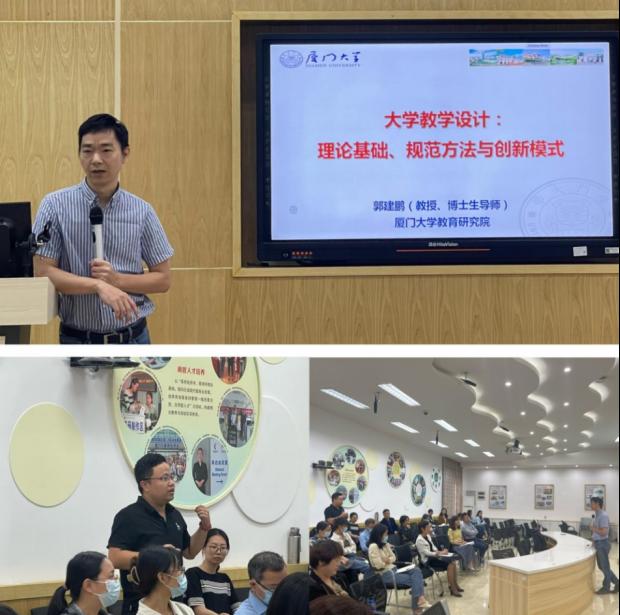 郭建鹏教授做了一场题为《大学教学设计:理论基础、规范方法与创新模式》的学术讲座。郭建鹏教授从大学教学中的常见问题出发,为老师们进行了深入浅出的讲解。郭教授认为在现代信息技术与教育教学的深入融合、高等教育改革趋势、社会发展变化态势等因素的影响下,大学教学更是要打好理论基础,规范教学方法,注重创新模式,以培养学生的高阶能力。