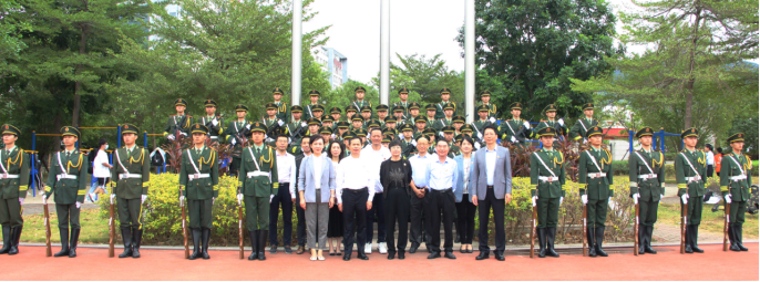 上午9点,在铿锵有力的“齐步走”口令声下,国旗护卫队昂首阔步,护送国旗进场;随着庄严的国歌奏起,五星红旗冉冉升起。