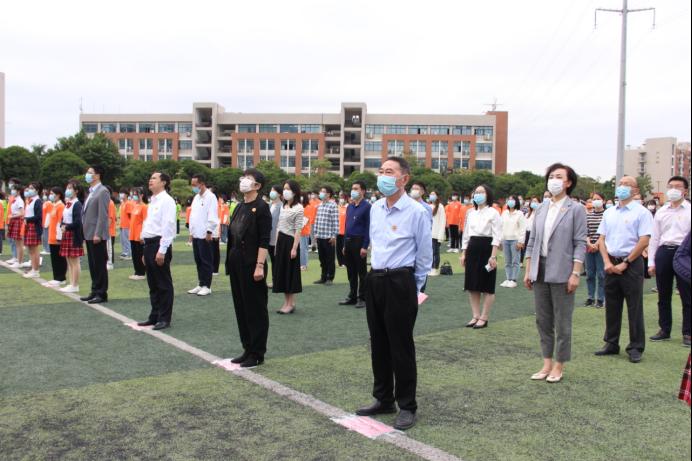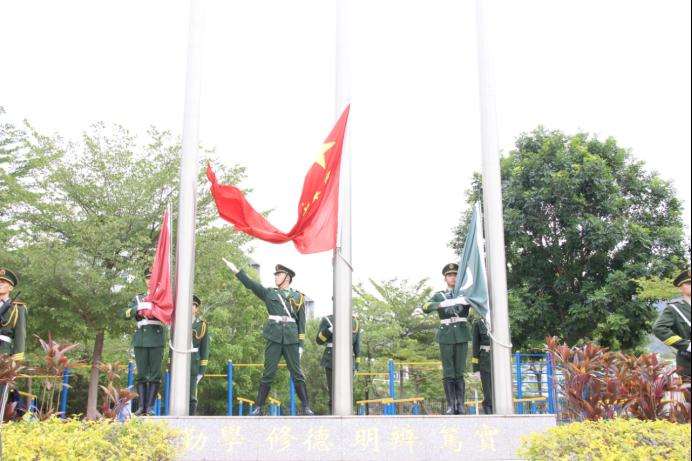 随后《华厦华厦,我心所依》响起,校旗和绿色华厦旗升起。催人奋进的歌词,优美的旋律,勾起华厦人的记忆,谱写着华厦的办学历程和成果。