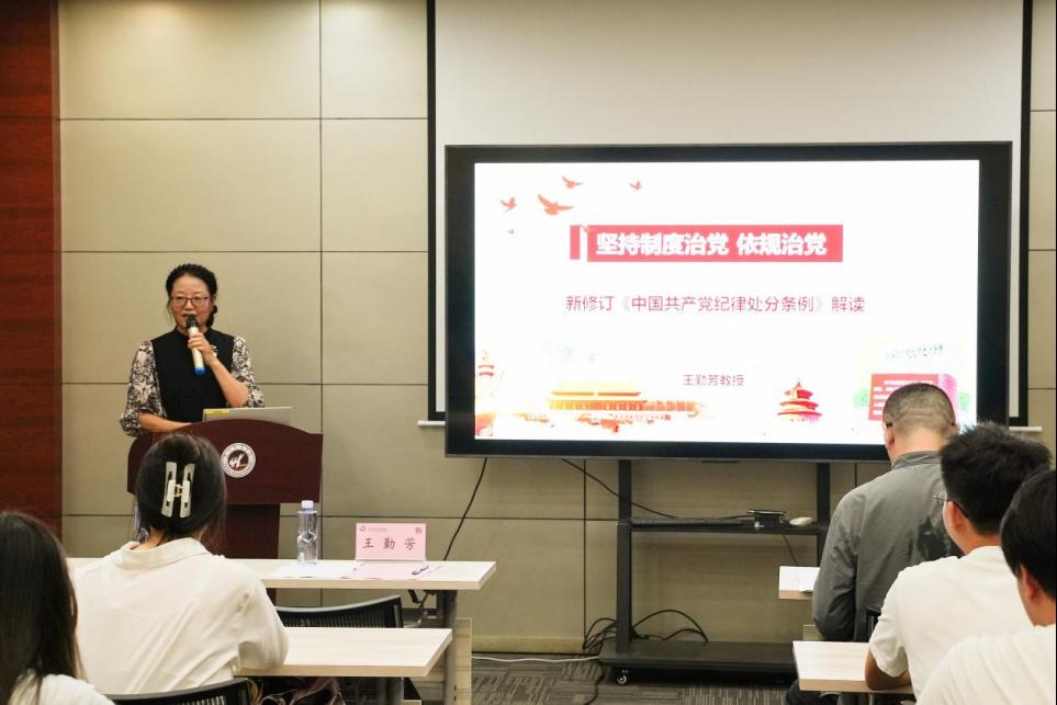 最后,商务与管理学院党总支书记李葳葳对会议进行了总结,对王勤芳教授的专题报告和精彩点评表示衷心感谢,要求与会师生要继续认真学习贯彻《条例》,带头学纪、知纪、明纪、守纪,用党规党纪校正思想和行动,不断增强志气、骨气和底气,争做“四有”好老师和有理想、敢担当、能吃苦、肯奋斗的新时代好青年。