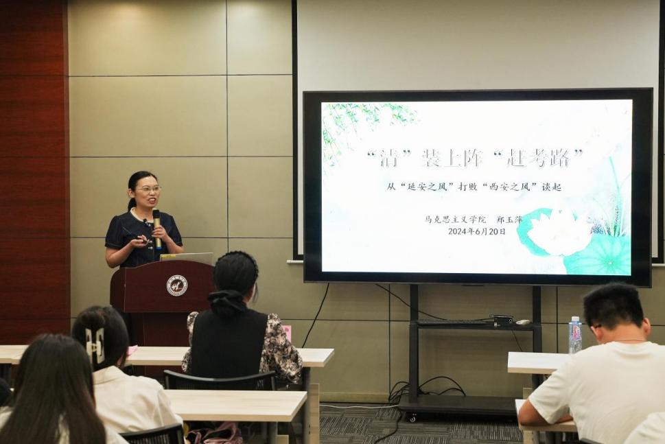 在廉洁文化课——“大练兵”教学展示暨集体备课环节上,马克思主义学院郑静、樊雅琴、郑玉萍和商务与管理学院苏淑毅等四位教师分别围绕“以党章党规为镜,践行‘三尺’之道,牢记初心使命”、“加强纪律性 革命无不胜——回顾党史上的两个‘三大纪律 八项注意’”、“‘清’装上阵‘赶考路’——从‘延安作风’打败‘西安作风’”、“正确的价值观对组织文化塑造的作用”四个主题,将党的纪律与廉洁文化融入思政课和专业课进行展示。