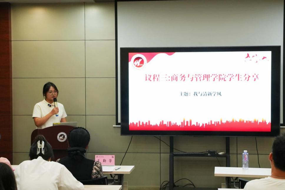 商务与管理学院党总支书记李葳葳主持学生分享和专家点评环节。在“我与清新学风”交流研讨环节,商务与管理学院党员学生代表傅琳茜、陈梦丽分别围绕“我与清新学风并肩前行”、“让清新学风点亮求知之路”展开分享,表示清新学风是同学们自强、自尊、自律、自爱的动力支柱,更是青年学生奋发向上、努力成才的强大精神力量。