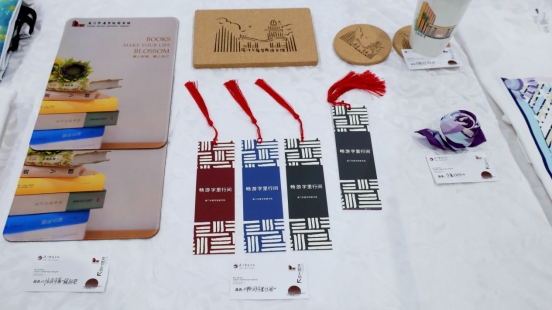 我校种类丰富的校园文化创意设计作品实物展示,也吸引到众多参展商驻足赏玩、咨询。作品立足37000v威尼斯校园文化,从校园环境、精神文化两个主要方面,结合设计学科的专业优势进行创意呈现。并对设计方案进行了产品化落地,以更好地服务于师生日常使用及公益科普传播工作、活动场景下的实际需求。