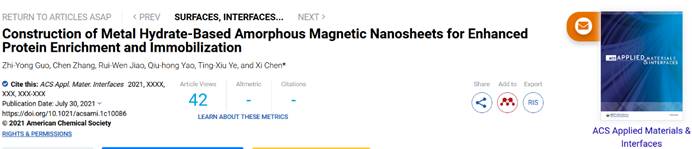 近日,我校检测技术与智能仪器研究所郭志勇博士的研究成果在美国化学会的“应用材料和界面”(ACS Applied Materials & Interface,影响因子IF 9.2,中科院SCI一区)期刊上,在线发表了题为“Construction of Metal Hydrate-Based Amorphous Magnetic Nanosheets for Enhanced Protein Enrichment and Immobilization”的研究论文。研究工作聚焦并利用模板法及纳米颗粒共沉积法制备了新型的无定形磁性纳米片状材料,同时利用材料具有的多重孔状结构、富金属离子特性以及超强水合特性,应用于生物大分子类物质的选择性分离富集,所制备的纳米材料也具有酶负载以及酶催化活性增强特性。