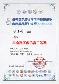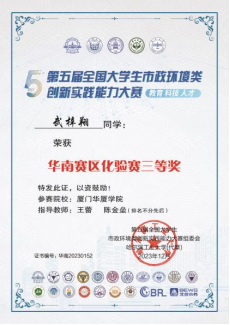 近日,在第五届全国大学生市政环境类创新实践能力大赛中,我校环境与公共健康学院学生积极参加,荣获华南赛区化验赛三等奖1项、虚拟仿真赛三等奖1项、优秀指导教师2项。