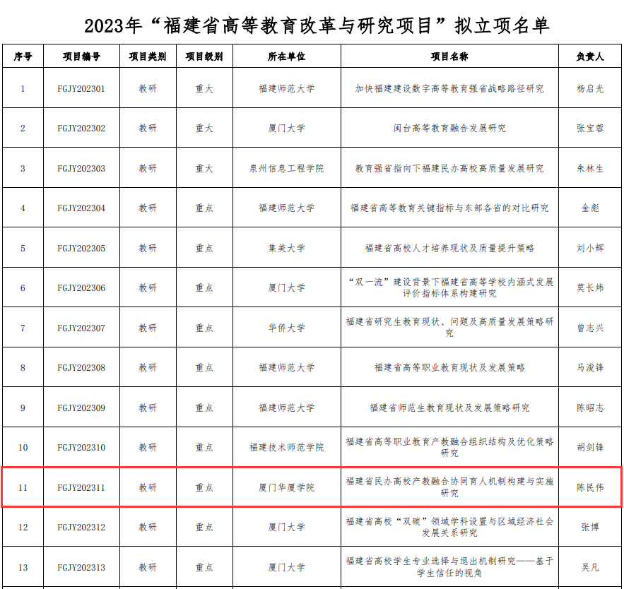 为推进福建省高校教育教学改革,福建省高等教育研究院开展2023年“福建省高等教育改革与研究项目”申报工作,此次全省共有36所高校701个项目参与申报,最终65个项目获得立项。其中,教研类重点项目立项10个(纵向项目资助经费10万元/项),我校是唯一一所获此立项的民办高校。福建省高等教育研究院是福建省依托厦门大学成立的智库机构,以厦门大学教育学国家一流建设学科团队为骨干力量,汇聚省内外高水平高等教育研究力量,协同开展福建高等教育改革发展的理论和实践问题研究,组织开展高校领导和管理干部培训,为政府部门和高校提供决策咨询服务,推动高校开展高等教育科学研究,打造福建高等教育高质量发展引擎。