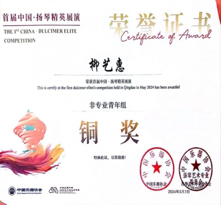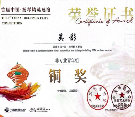 本次大赛竞争非常激烈,我校人文学院23级音乐学吴影、柳艺惠两名学生,从初赛、复赛、决赛的五百位选手中脱颖而出,历经半年比赛过程,最终获得青年组铜奖的好成绩。这是我校师生在国际级赛事中扬琴专业的最好成绩,指导老师为我校兼职教师,硕士生导师、旅德博士后、青年扬琴演奏家王荟。