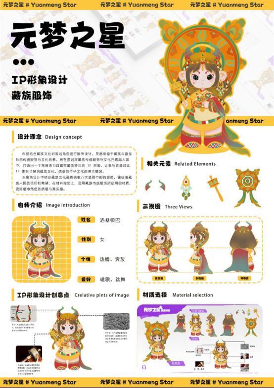 郭小宇同学凭借扎实的专业基础和独特的创意理念,成功脱颖而出,赢得了评委和观众的高度赞誉。《元梦之星—IP形象设计之藏族服饰》作品结合藏族文化对游戏角色进行服饰设计,灵感来源于藏族丰富多彩的传统服饰与文化元素,旨在通过将藏族传统服饰与文化元素融入其中,打造出一个充满活力且富有藏族特色的IP形象,让参与者通过此IP更好了解到藏族文化,感受到中华文化的博大精深。本角色设计中结合藏族文化藏传佛教八大法器中的转金筒,象征着藏族人民的信仰和希望,在材料指定上,运用藏族传统服饰所使用的材质,更好地增添了角色的质感与真实感。