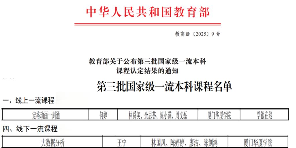 近日,教育部发布《教育部关于公布第三批国家级一流本科课程认定结果的通知》(教高函〔2025〕9号),我校两门课程成功入选。其中,《定格动画一刻通》被认定为国家级线上一流本科课程,《大数据分析》被认定为国家级线下一流本科课程。截至目前,学校已建成国家级一流线下课程两门、线上课程一门。