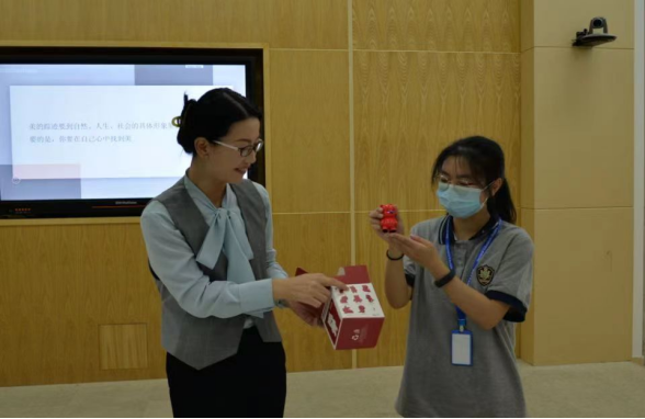 讲座伊始,刘芸老师作为欣赏艺术的引路人,带着师生们一起攀越艺术之山。首先,刘芸老师介绍创新运用网上模拟看展的方法,向同学们展现当代艺术设计的案例:“厦门万象城—闽艺复兴”、“厦门国际游艇汇—公共艺术展”、“澳头公共艺术展”等众多公共艺术展览。同时,刘芸老师也从“看展前准备”、“看展看什么”两个全新角度向同学介绍了应如何感受图片与现场的不同,学会如何观展。刘芸老师以自身深厚的文化艺术底蕴结合两座名为《侍》与《夜》的实物雕塑,向同学们阐述了雕塑的定义、描述了雕塑的制作流程、呈现了雕塑的精美创作,使同学们在一定程度上丰富了自身在欣赏雕塑时的知识储备。随后,刘芸老师与同学们共同追溯漆画的历史脉络,从西汉时期的朱底彩绘漆棺,到三国两晋南北朝时期的彩绘宴乐圆漆盘,再到宋元时期的描金堆漆经函,这些无不一一体现了古代人民的艺术智慧,让同学们能够以更近的距离去感受传统文化艺术,增强民族文化自信。最后,刘芸老师与同学们以问答的活动形式一起欢悦互动,并赠予同学们精心准备的小礼品。刘芸老师的专业讲解让在座的同学们受益匪浅,受到在座师生的一致好评。