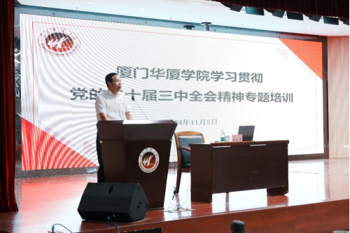 11月5日下午,学校党委召开专题培训会,进一步深入学习贯彻党的二十届三中全会精神。厦门大学党委常委、宣传部部长高和荣教授受邀作题为《学习贯彻党的二十届三中全会精神》专题报告。学校党委书记徐志怀、校长谢增鸿等党政领导出席会议,党员教师、学生代表参会学习。会议由校党委书记徐志怀主持。