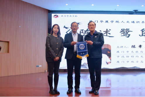 讲座结束后,我校通识课程建设委员会主任刘海翔教授为陈章志颁发致谢旗,并合影留念。