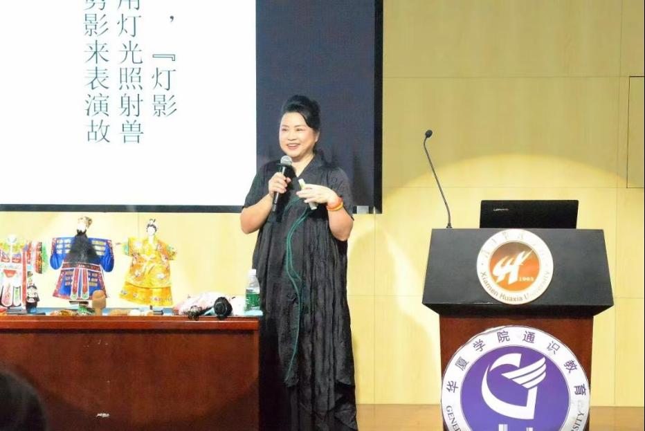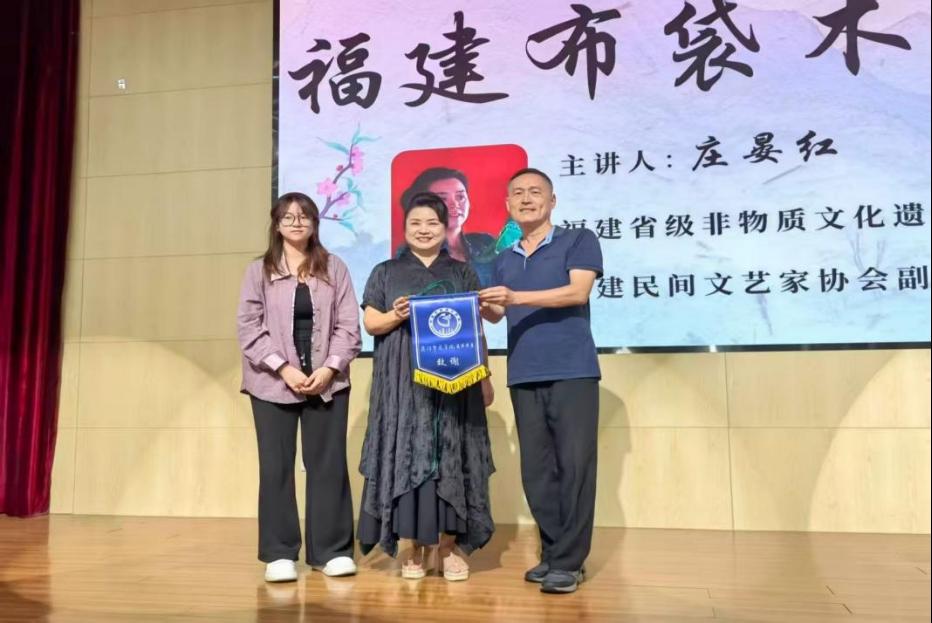 在讲座中,庄晏红女士重点聚焦于布袋木偶戏的艺术特色。她通过实物拆解,详细讲解了木偶头从樟木雕刻、贴纸、上土到绘脸的精湛工序,并深入介绍了戏服“真丝绸缎手工刺绣”与“凸绣龙袍”等独特技法。在表演层面,她详解了以“食指操控头部、拇指支配手部”的核心操纵方式,并引用“一口说尽千古事,双手弄出百万兵”,生动阐释了其“一人多角、声形兼备”的表演艺术精髓。她还特别提及布袋木偶戏已赴全球五十多个国家展演,有效推介了中华优秀传统文化,展现了其当代国际影响力。